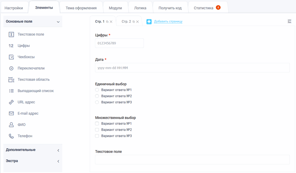 В разделе «Элементы» можно добавить, удалить либо отредактировать поля для заполнения. Они могут быть текстовыми, цифровыми, с изображением и т.д. Помимо этого, у вас будет возможность установить кнопки социальных сетей.