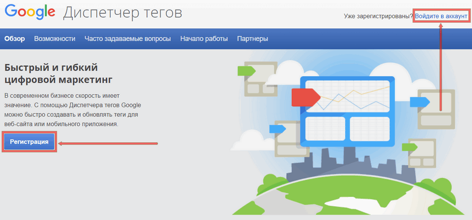 Для того, чтобы подключить Google Tag Manager, Вам необходимо перейти на сайт Google Tag Manager и зарегистрироваться или авторизоваться в Google аккаунте.