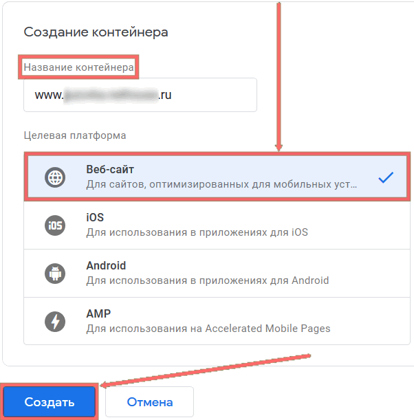 В поле "Создание контейнера" заполните название контейнера (например, адрес