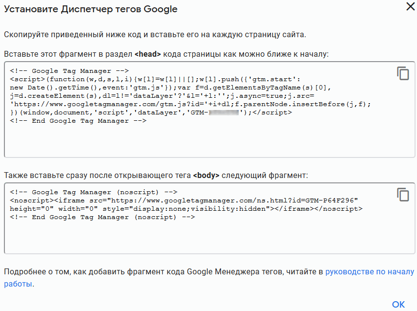 В Диспетчере тегов Google скопируйте приведённые коды и вставьте на каждую страницу сайта. В иных случаях, например, в "nethouse" скопируйте код <head>, для WP только id тега в виде "GTM-XXXXXXX":