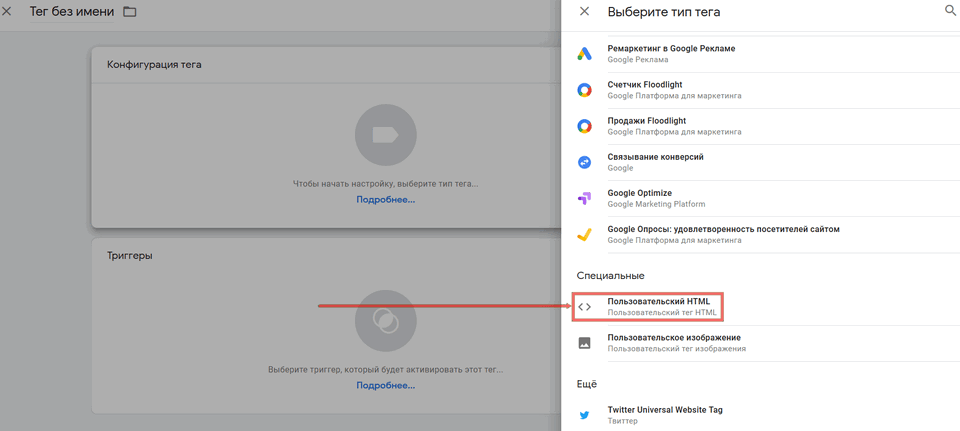 В типе тега опуститесь ниже до раздела "Специальные" и выберите "Пользовательский HTML":