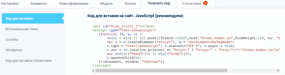 В нашем конструкторе в необходимой форме перейдите во вкладку "Получить код" и скопируйте "Код для вставки на сайт JavaScript (рекомендуем)":