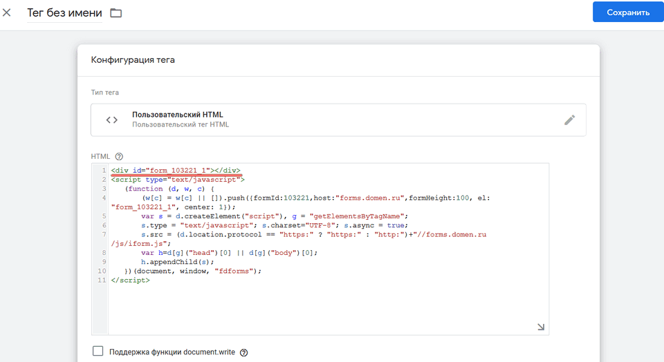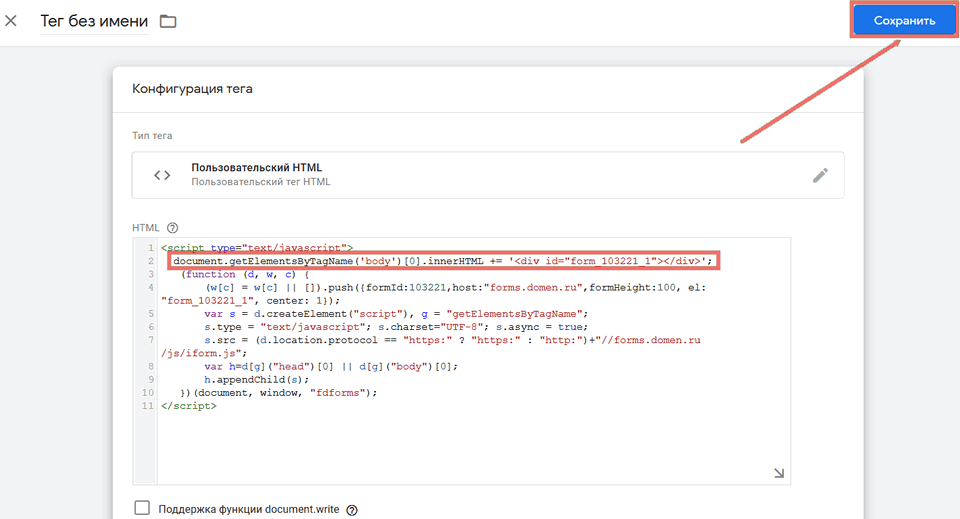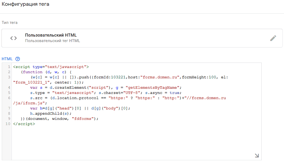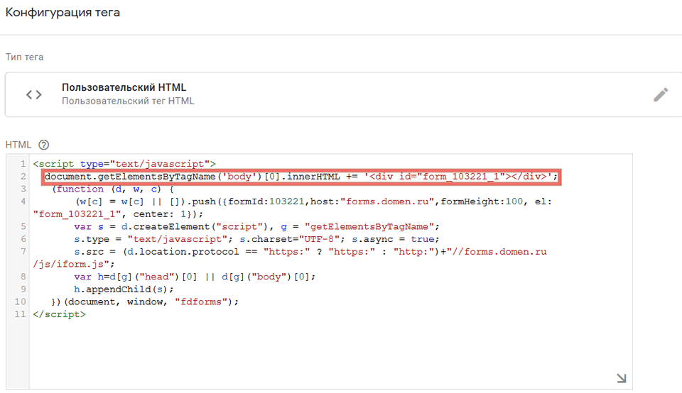 Вставьте его в Диспетчере тегов Google, пользовательский HTML, который ранее открыли. Удалите первую строчку вида <div id="form_103221_1"></div>