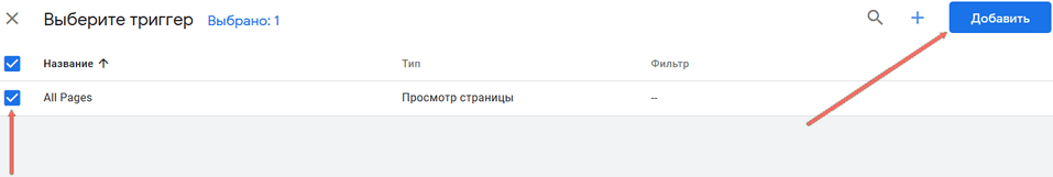 Активировав чекбокс "All Pages" и нажав кнопку "Добавить", Вы выбрали триггер к тегу: