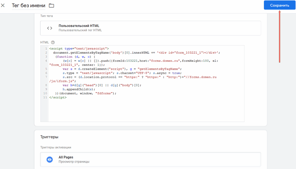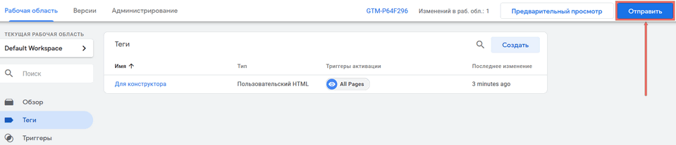 В Диспетчере тегов нажмите кнопку "Сохранить":