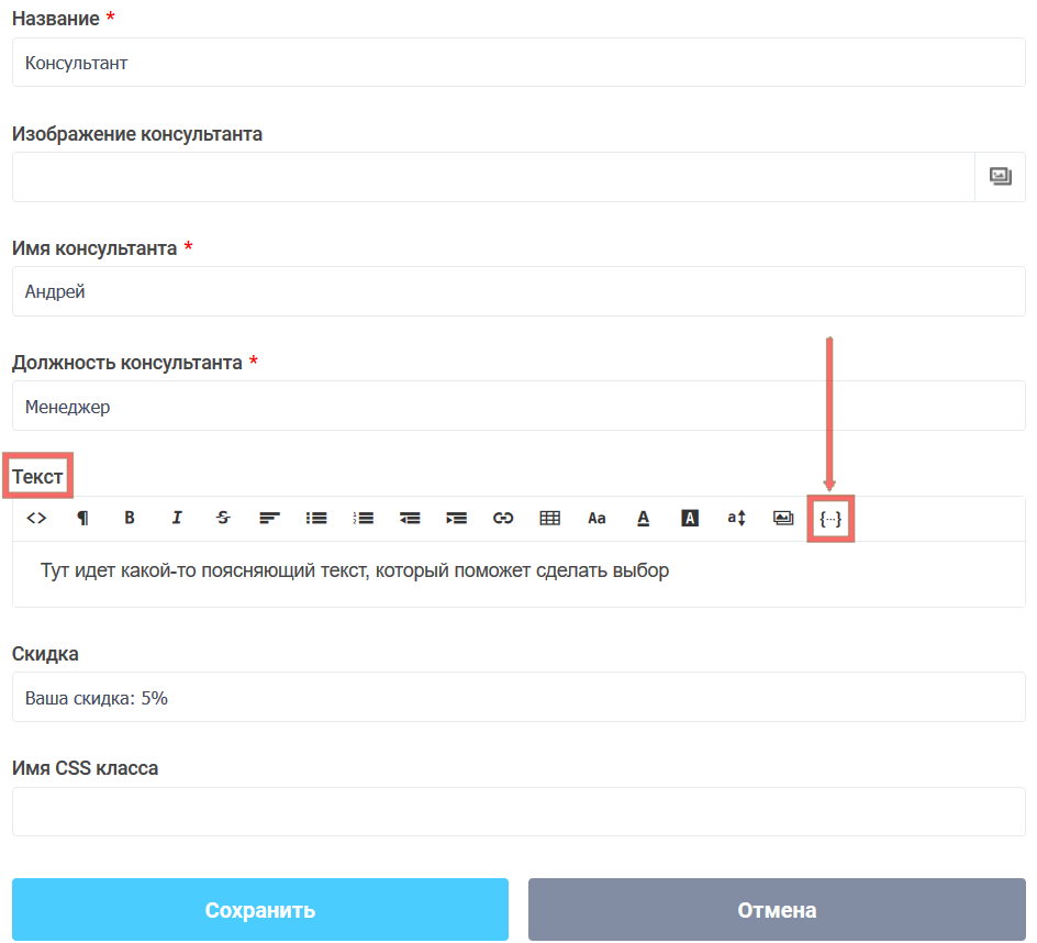 В настройках этого элемента есть поле "Название", где вы можете изменить описание консультанта, чтобы в логических правилах не путаться на какой странице находится какой консультант. В полях "Имя консультанта" и "Должность консультанта", Вы может указать имя и должность соответственно, которые буду выводится в форме. В поле "Текст", Вы можете задать поясняющий текст, который будет отображаться ниже аватара консультанта, а также указать размер скидки в поле "Скидка", которая будет выводится в заголовке элемента.