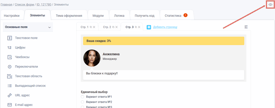 консультантов на разных страницах.Добавим, например, переключатели и консультантов на трёх страницах и откроем форму в режиме просмотра: