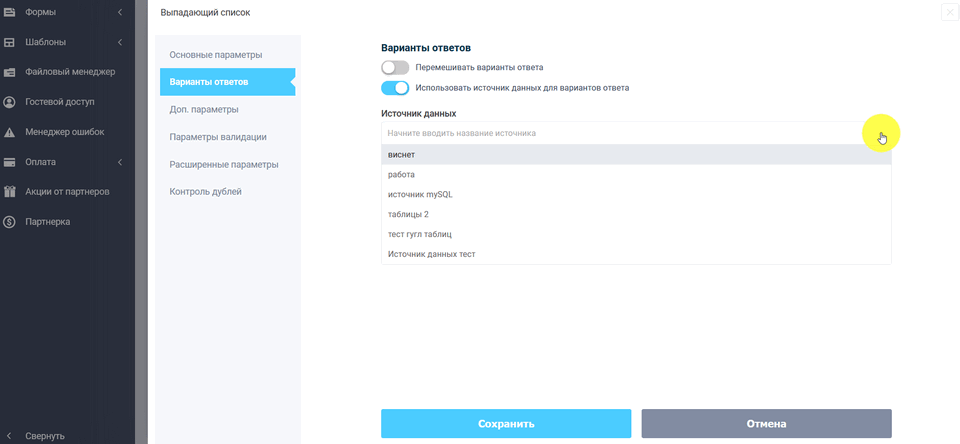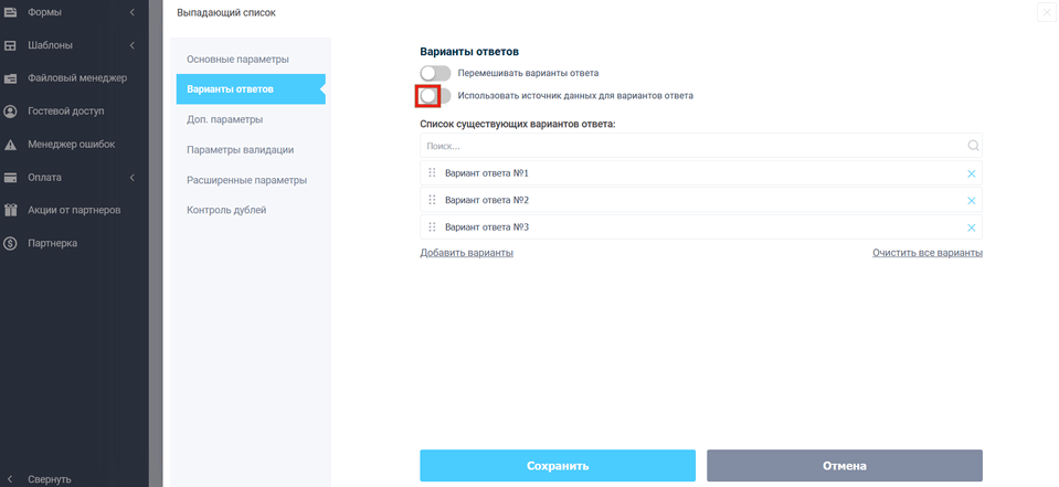 Также в качестве вариантов ответов можно использовать источники данных. Для того, чтобы добавить источник данных, необходимо активировать переключатель: