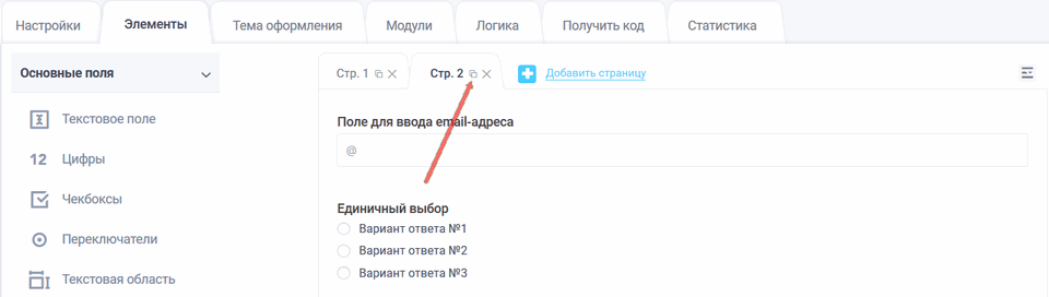 Если у Вас на страницах будут одинаковые элементы, то Вы можете просто скопировать страницу, не наполняя её элементами, а просто, отредактировав элементы. Чтобы скопировать страницу, необходимо нажать на значок "Копировать" рядом со страницей:
