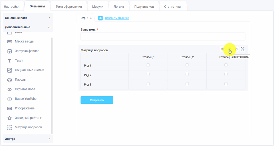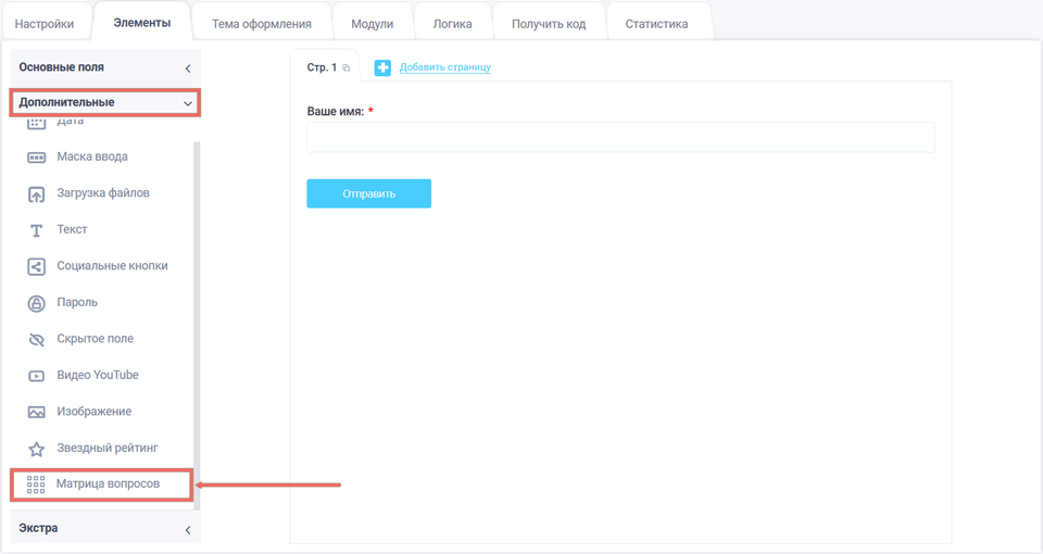 Чтобы добавить элемент "Матрица вопросов" в форму, перейдите во вкладку элементы и выберите "Дополнительные":