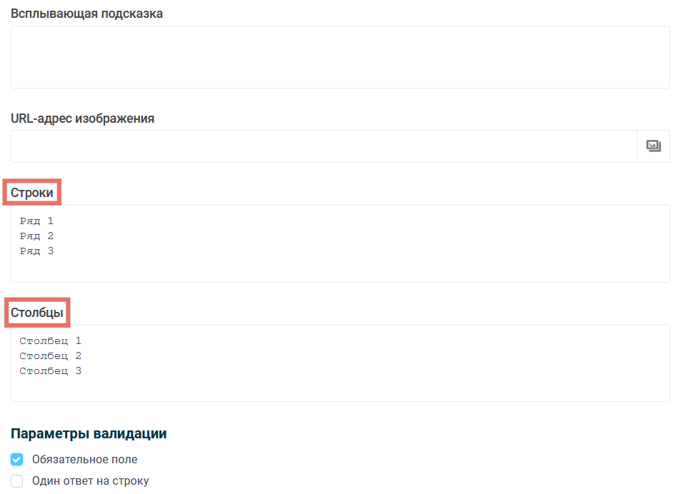 Чтобы зайти в настройки элемента, нажмите значок "Редактировать" и перед Вами отобразятся настройки. Здесь в полях "Строки" и "Столбцы", можете указать необходимые варианты строк и столбцов, соответственно: