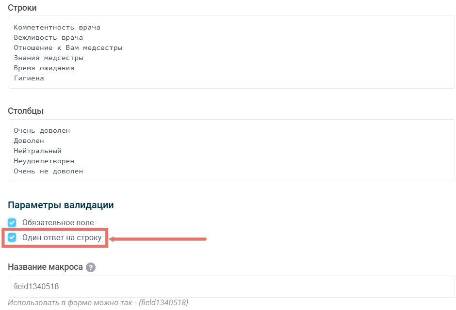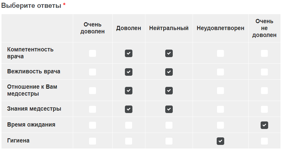 Матрица вопросов - это сочетание нескольких вопросов с одинаковыми ответами. По сути это таблица, где в качестве строк вы задаете вопросы, а колонки являются вариантами ответа и пользователь в ячейках проставляет свои варианты ответа. Для матрицы вопросов хорошо подходят вопросы со шкалами и градациями. Типичным примером является шкала Лайкерта. Вопросы в матрице значительно сокращают опрос и делают его более наглядным.