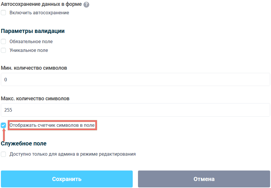 Если вы активируете чекбокс "Отображать счётчик символов в поле", то будет выводиться блок с количеством символом и максимальным значением текстового поля. Чтобы просмотреть как будет выглядеть форма, кликните на иконку "Просмотра":