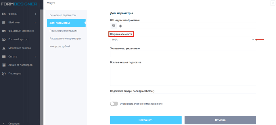В поле "Ширина элемента", вы можете настроить ширину поля в процентном отношении от ширины формы: