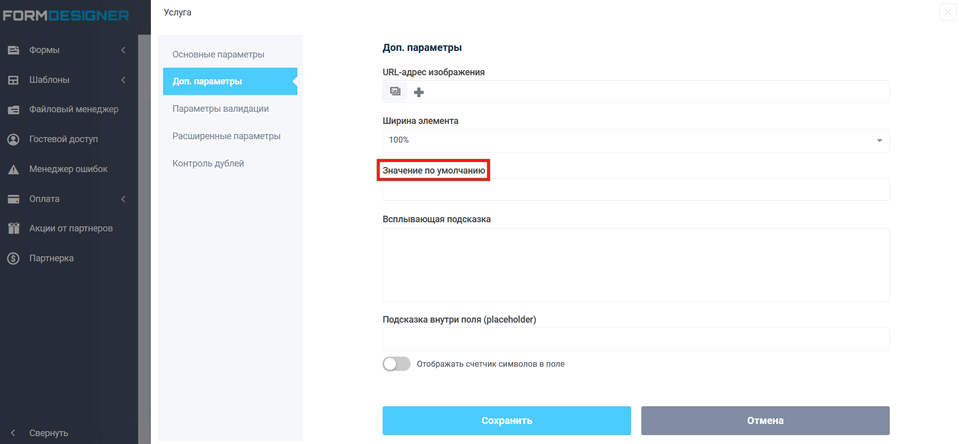 В следующем поле "Значение по умолчанию", будет отображаться определённый текст, до того момента, пока пользователь не начнёт вводить данные, при этом он должен удалить текст по умолчанию. Чтобы текст отображался только до момента ввода информации, для этого используется "Подсказка внутри поля (placeholder)".