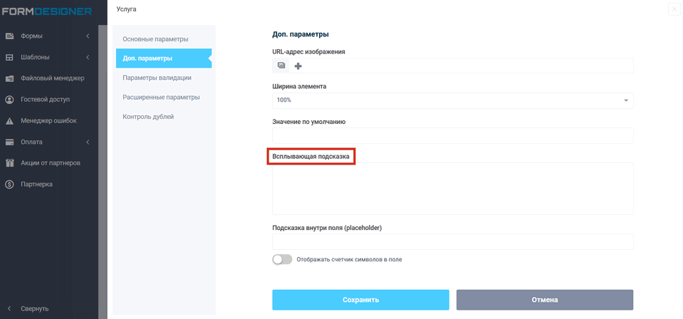 В поле "Всплывающая подсказка", вы можете настроить информацию при наведении курсора на это поле (также есть возможность изменить внешний вид подсказки: для этого нужно зайти во вкладку "Тема оформления". Слева кликните "Подсказки"):