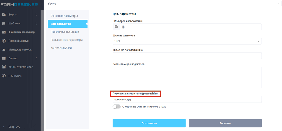 Поле "Подсказка внутри поля (placeholder)" отображает информацию в поле, при введение в это поле данных, подсказка убирается: