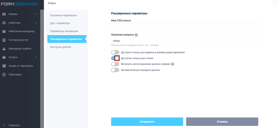 Если активировать в элементе переключатель "Только для чтения", то в элементе нельзя будет внести данные или выбрать вариант ответа. Очень удобно, когда настраивая логические правила, и автоматически устанавливая значения в поля, необходимо сделать возможность запретить редактировать значение в этом поле.