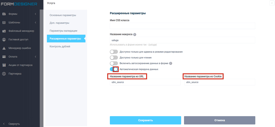 С помощью опции "Автоматическая передача данных" можно настроить автоматическую передачу данных из URL или куки в нужное поле веб-формы, и для этого не нужно менять код формы на сайте. Активировав опцию, отобразятся два поля "Названия параметра из URL" и "Название параметра из Cookie":