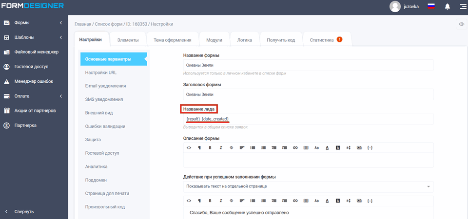В поле "Название лида", Вы можете указать название, которое будет выводится в общем списке заявок на главной странице в личном кабинете. В название можно использовать макросы из формы, по умолчанию поле не заполнено и будет выводится номер заявки, название формы: