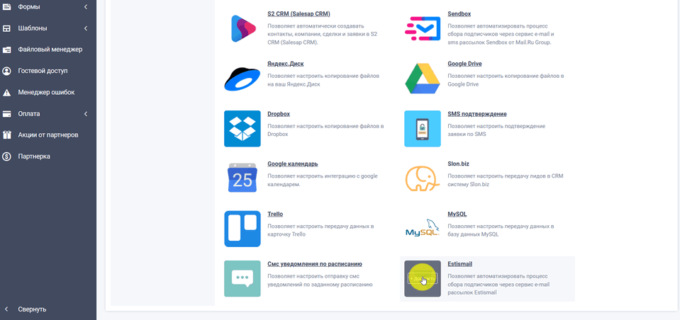 Для того, чтобы настроить интеграцию с сервисом, Вам необходимо перейти в нужной форме в раздел "Модули" и найти "Estismail":