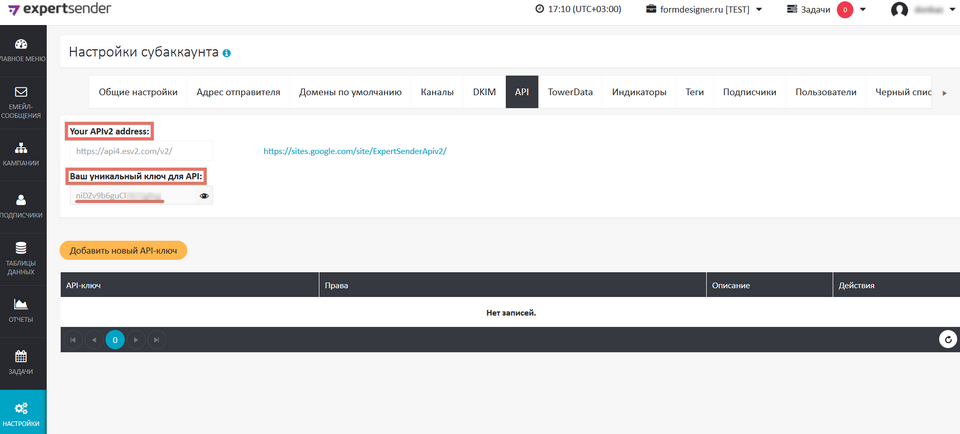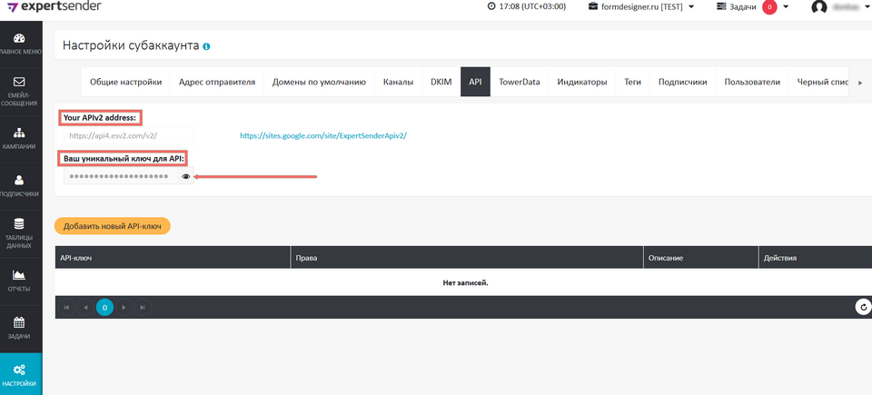 Ключ доступа к API вы можете найти в своей учётной записи ExpertSender. Зайдите в настройки и выберите раздел "Субаккаунт":