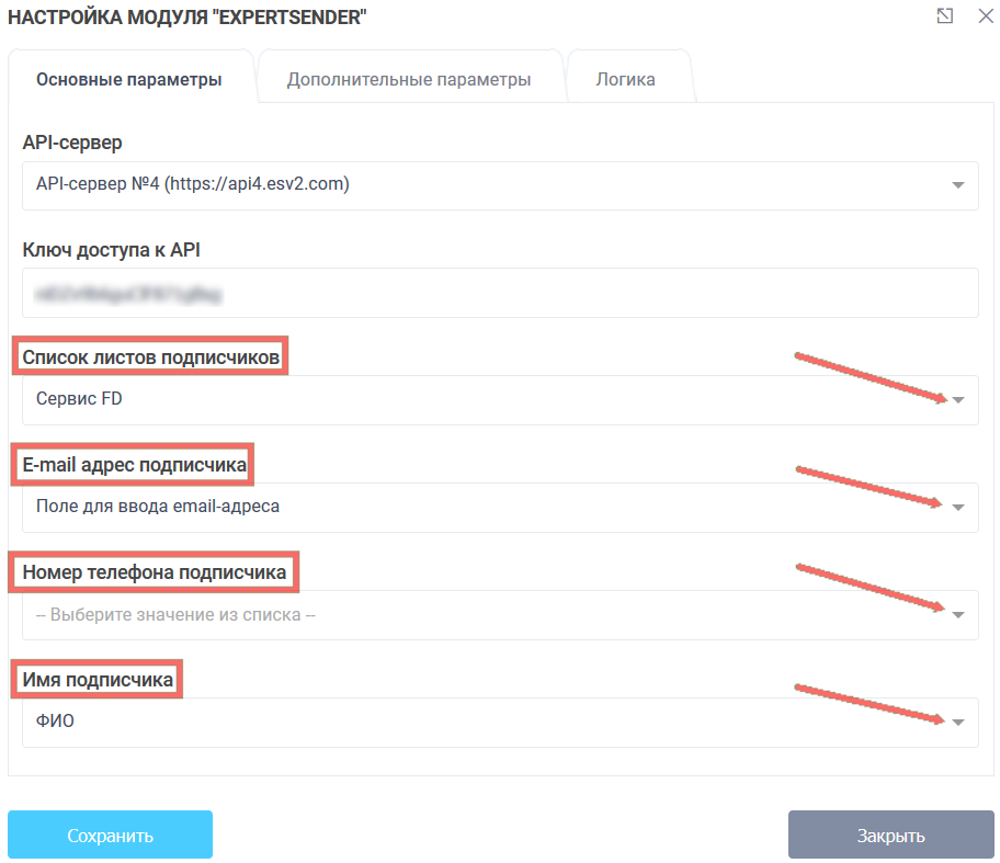 Здесь необходимо выбрать рассылку, на которую будут подписываться пользователи, заполнившие форму. Далее нужно выбрать элемент формы, который будет содержать "E-mail адрес подписчика" или "Номер телефона подписчика" (обязательные поля), и "Имя подписчика". Соответственно у Вас должны быть эти элементы в форме. После того, как все данные заполнены необходимо нажать на кнопку "Сохранить" и модуль интеграции с ExpertSender будет активирован, а все пользователи заполнившие форму, будут автоматически попадать в список подписчиков ExpertSender, и вам не потребуется загружать их вручную.