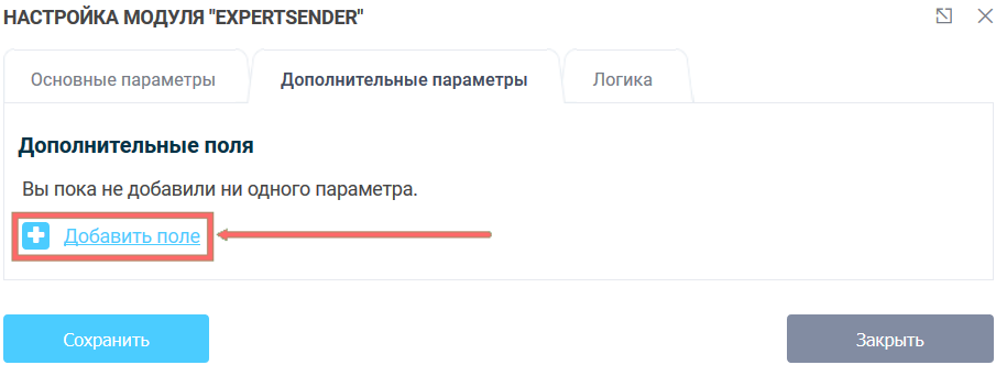 Во вкладке "Дополнительные параметры", вы можете добавить поля из ExpertSender и выбрать соответствующее поле из формы. Для этого кликните иконку "Добавить поле". Когда добавите дополнительное поле, слева будет выводиться список полей из ExpertSender, а справа – из формы.