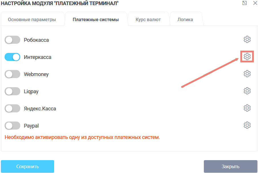 Чтобы активировать платежную систему Интеркасса, нужно кликнуть на переключатель. После чего необходимо перейти к настройке данной платежной системы, нажав на "шестерёнку", напротив платёжной системы: