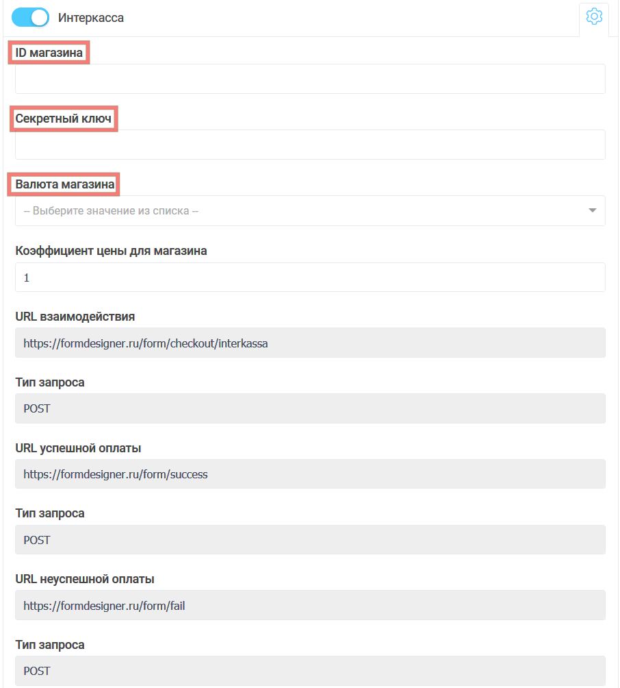 Перед вами откроется ряд текстовых полей, в которые необходимо ввести данные платежной системы. Те поля, которые подсвечены серым цветом, доступны лишь для чтения, а данные из них необходимо ввести в настройки магазина на сайте Интеркассы: