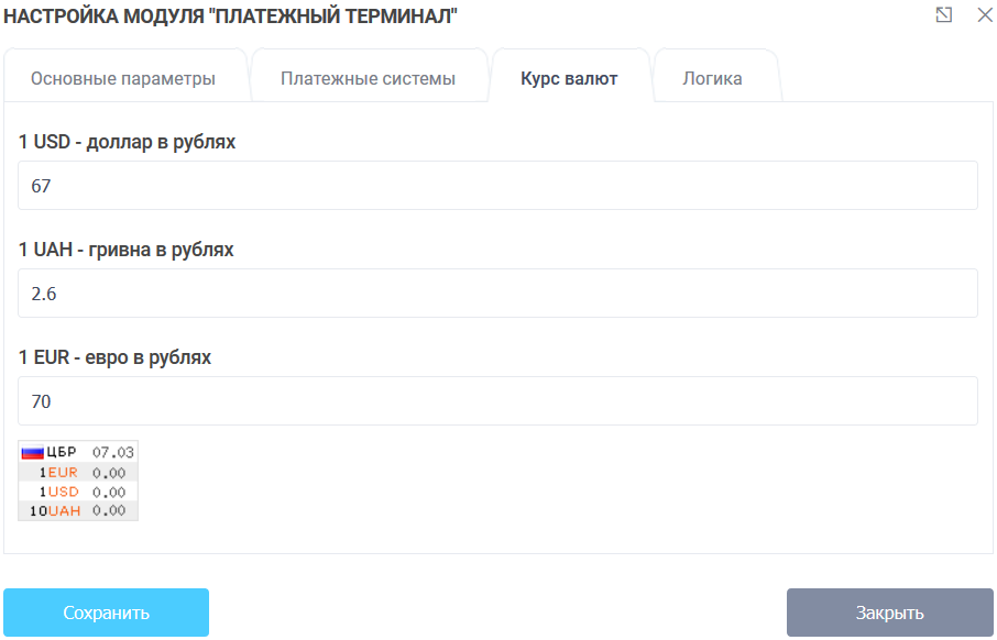 Так как цена товара может быть в одной валюте, а в разных платежных системах валюта магазина может отличаться, поэтому для правильного пересчета цены мы ввели курс валют, который Вы сами задаете.