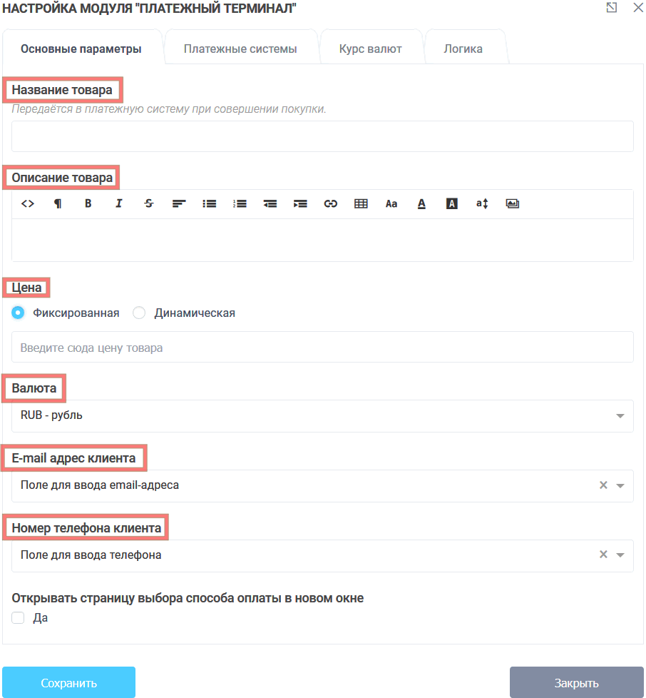 Также можно включить чекбокс, чтобы выбор способа оплаты открывался в новом окне.