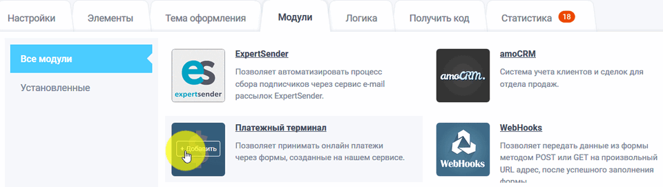 Перед вами откроется список всех доступных модулей. Кликните на иконку "+Добавить" в пункте "Платёжный терминал":