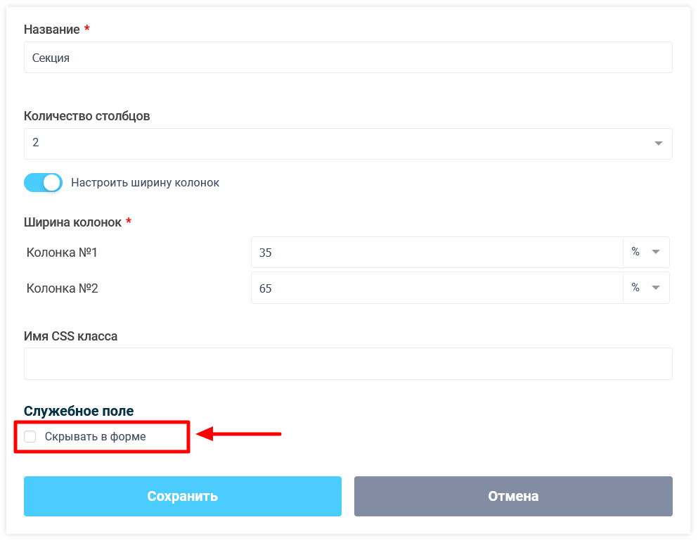 Кроме этого, мы добавили возможность помечать любой элемент формы, как скрытый. Для этого внизу настроек в разделе "Служебное поле" мы добавили еще один чекбокс "Скрывать в форме":