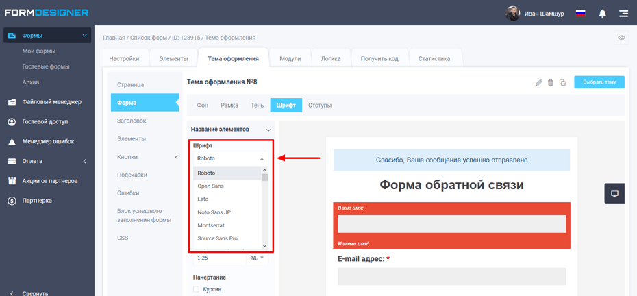 И вот сегодня мы добавили полную поддержку гугл шрифтов в наших формах. Теперь в теме оформления в списке шрифтов вы можете найти любой нужный вам шрифт: