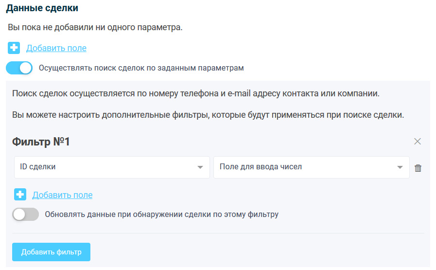 Нас довольно таки часто спрашивали, как настроить так, чтобы если у контакта уже есть созданная сделка, то при отправке новой формы не создавать новую сделку? Раньше такое нельзя было настроить. Но в новой версии теперь вы сами можете настраивать по каким параметрам искать сделки.