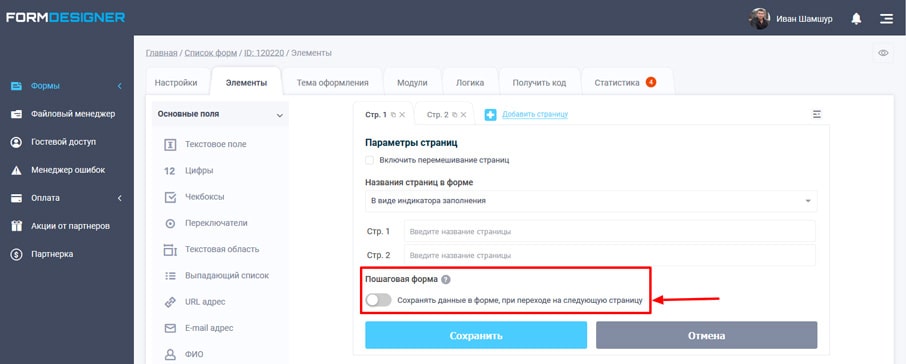 Здесь вам нужно в разделе “Пошаговая форма” активировать переключатель “Сохранять данные в форме, при переходе на следующую страницу”, после чего необходимо сохранить изменения в форме.