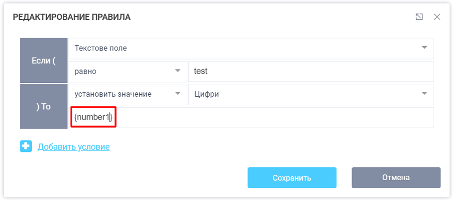 На картинке выше, мы сравниваем значение поле “Цифры” с другим полем, у которого настроен макрос - {number2}.
