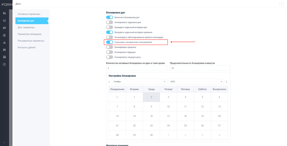 После чего необходимо перейти в раздел “Блокировка дат”, где будет выводиться новый переключатель “Учитывать часовой пояс пользователя”: